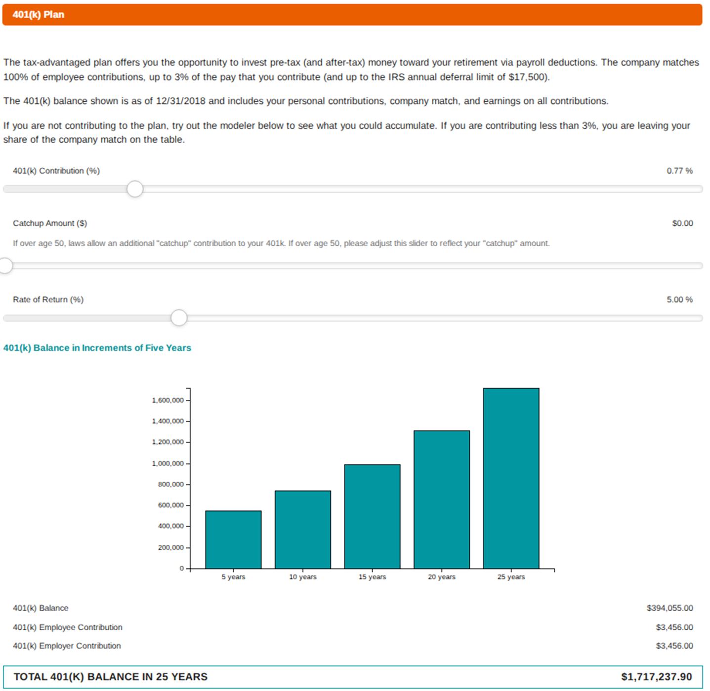 An online retirement calculator or a tool that lets employees model different contribution amounts and experiment with various rates of return. It shows potential retirement account balances at retirement age, helping to encourage awareness and increase participation in your organization’s retirement plans.